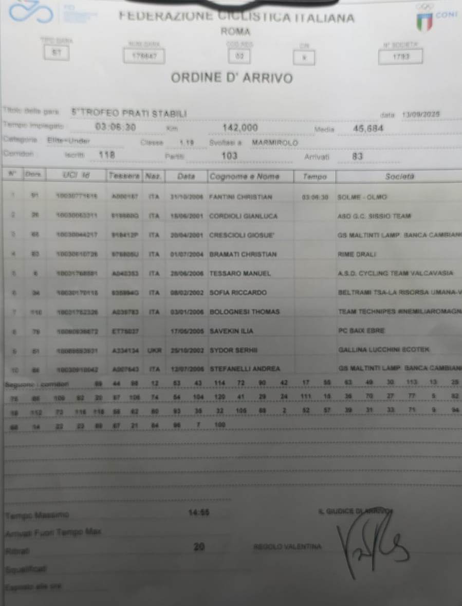 Il gruppo serra i ranghi e affida il finale ai velocisti; Cordioli è abile a prendere la testa della corsa, ma ai 50mtr esce di prepotenza Fantini che esulta a braccia alzate.