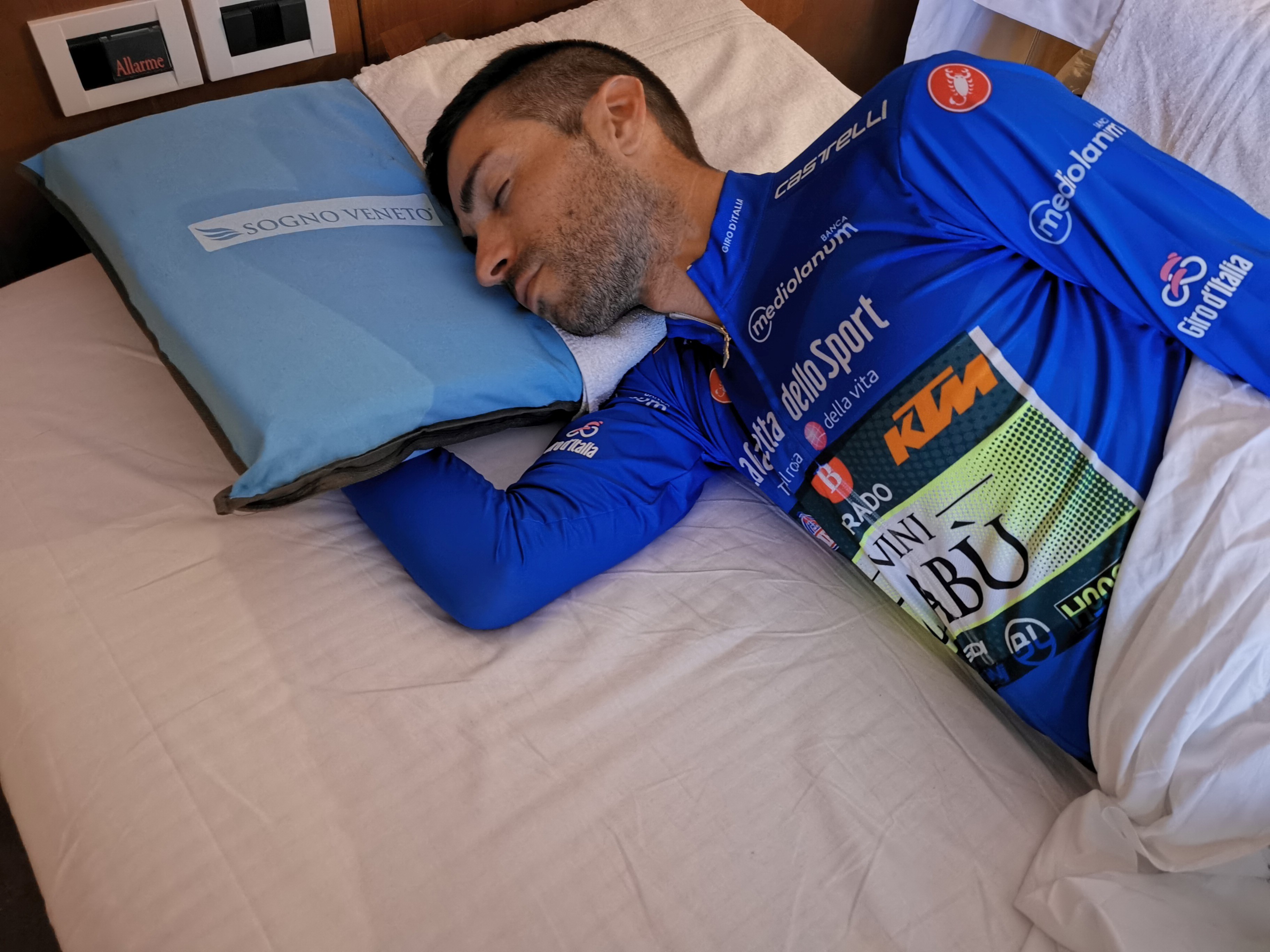 Every morning our staff gets to the hotel where the team will stay to change mattresses and pillows with the ones provided by Sogno Veneto to favour the rest of our riders including the new Blue Jersey Giovanni Visconti.