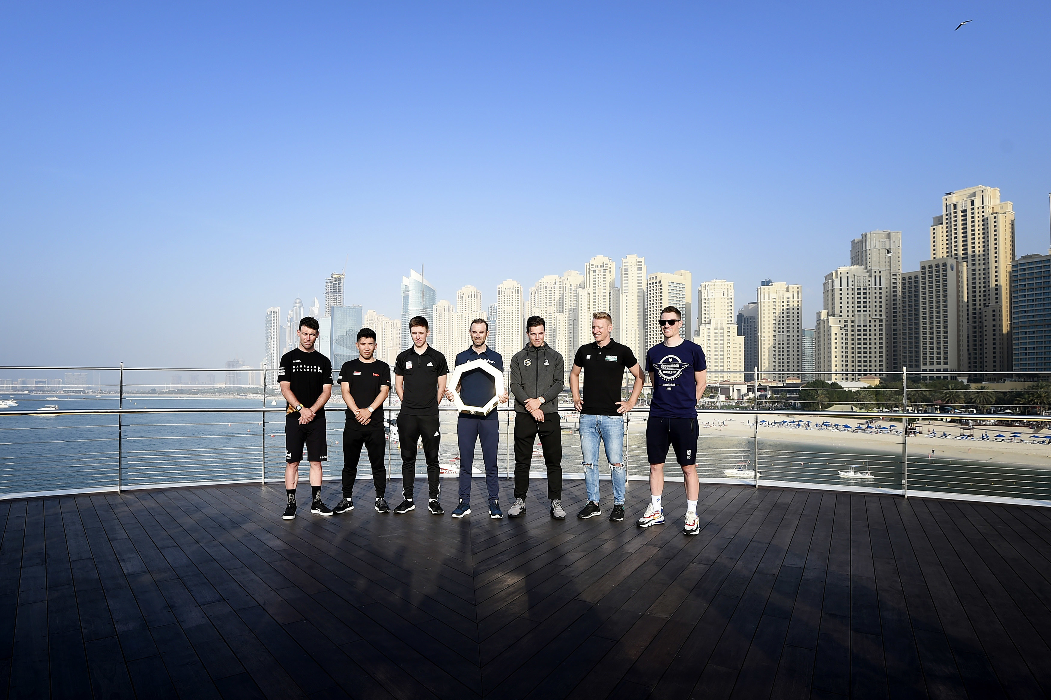 The UAE Tour Top Riders pictured from Bluewaters with the backdrop of Dubai Skyline,