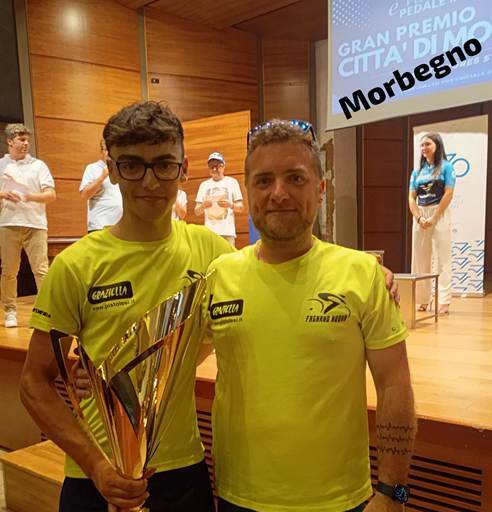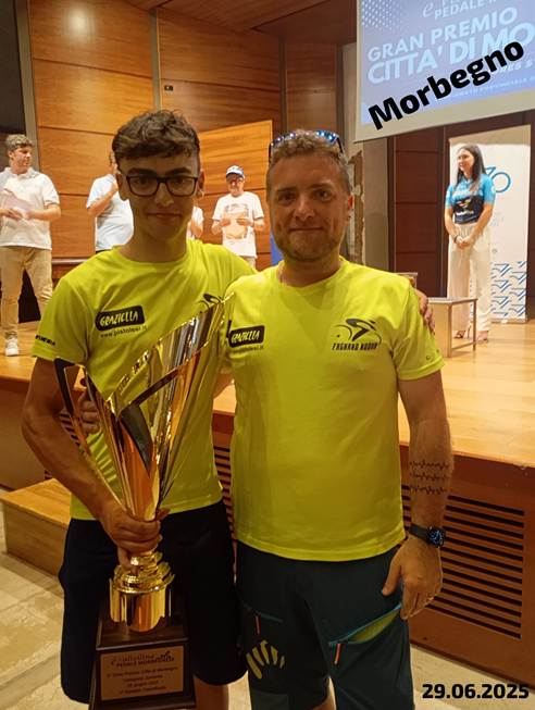 Nella foto qui sopra, Jordan Vignati col suo Direttore Sportivo a Morbegno il 29 Giugno 2025 nel momento della premiazione come vincitore del Gran Premio Città di Morbegno, categoria Juniores, il giorno 29 giugno 2025.