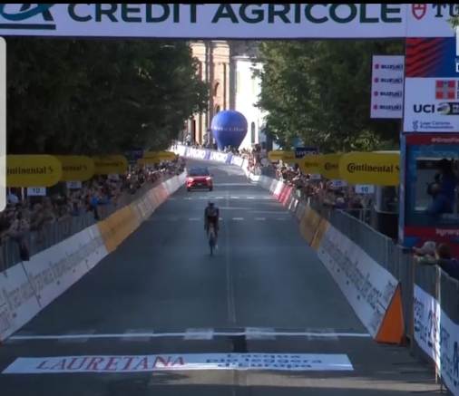 Con Bauke Mollema allora si lancia all’inseguimento di Hirschi e lo raggiungono, nemmeno il tempo di tirare il fiato e…alè…all’arembaggio lasciando quasi surplace Hirschi e quasi subito anche Mollema iniziando così la sua personale sfilata trai i vigneti della zona per tagliare il traguardo in solitaria nella cittadina termale di Acqui Terme.