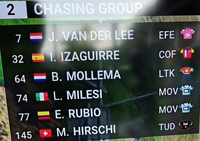 .I 3 corridori di cui sopra erano in fuga al primo passaggio sulla salita di Castelletto d’Erro inseguiti ai 6 corridori che leggiamo su questo fotopannello.