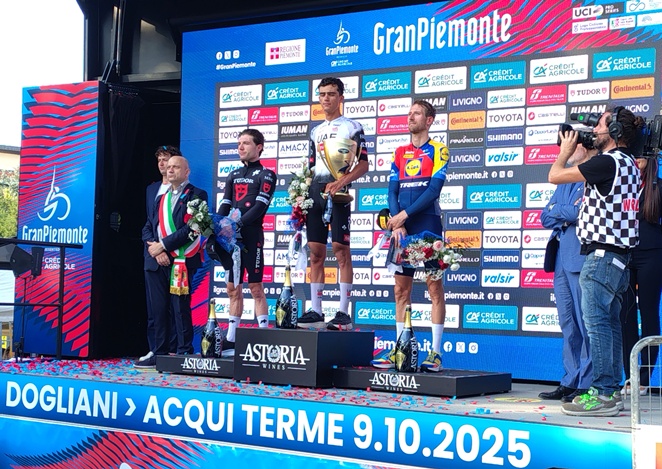 179 i chilometri che separano Dogliani nella Provincia Granda da Acqui Terme nel Monferrato in provincia di Alessandria e Del Toro ha pedalato in 4 ore, 8 minuti e 24″ quasi sempre in gruppo salvo gli ultimi chilometri quando al secondo passaggio sul Castelletto D’Erro rompe gli indugi per scardinare il “catenaccio” Tudor.