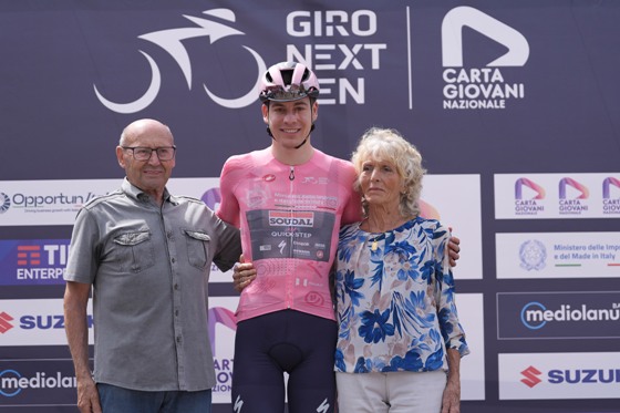 Jonathan Vervenne maglia Rosa con i Genitori di Fabio Casartelli