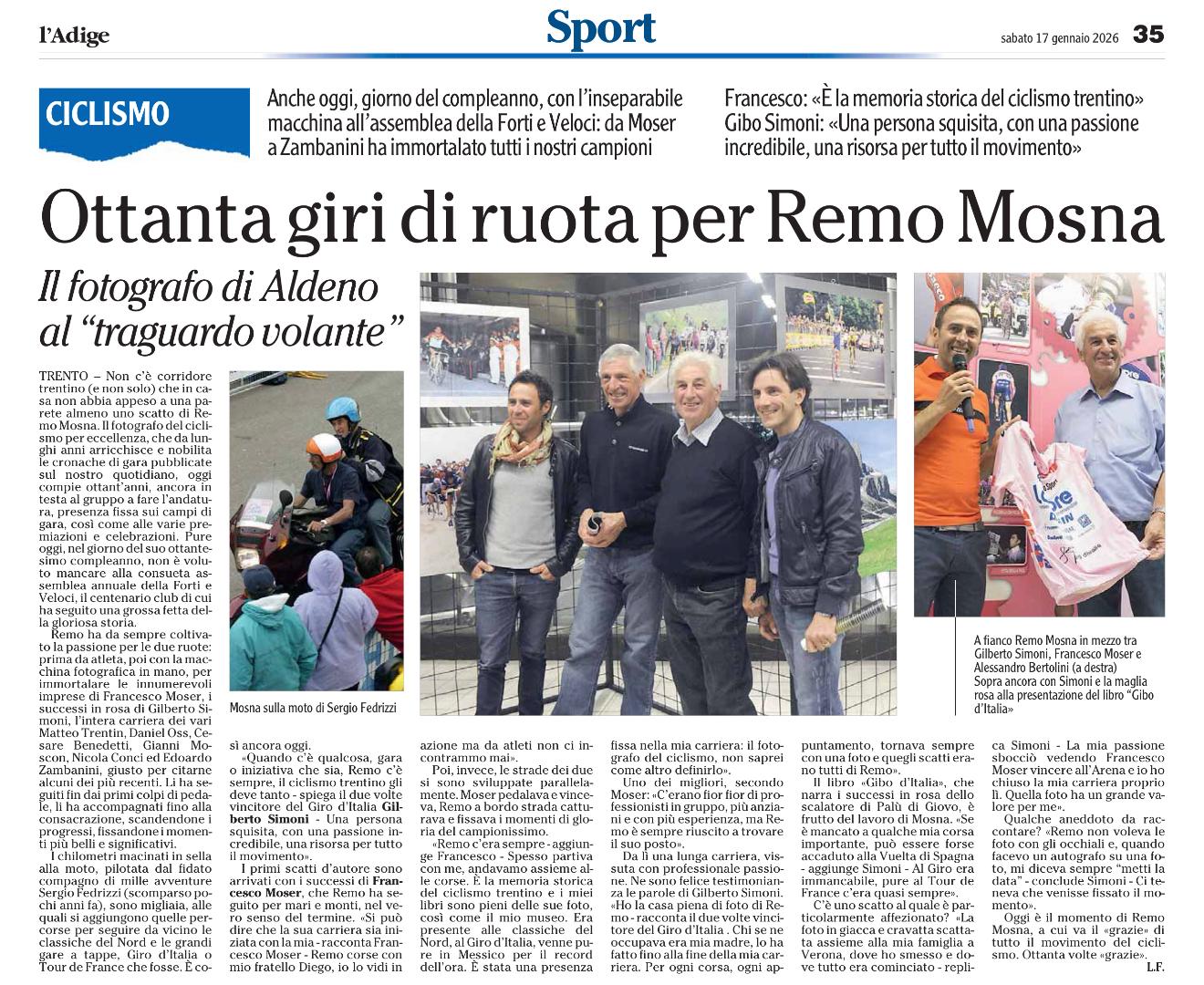 Oggi l’Amico Remo Mosna compie 80 anni : Tanti auguroni da Vito Bernardi e tutta la Redazione di www.pedaletricolore.it che, prendendo a prestito la bellissima “titolazione” ei Colleghi del Quotidiano Trentino l’Adige applaudiamo convinti ai suoi “Primi” 80 Giri di Ruota.