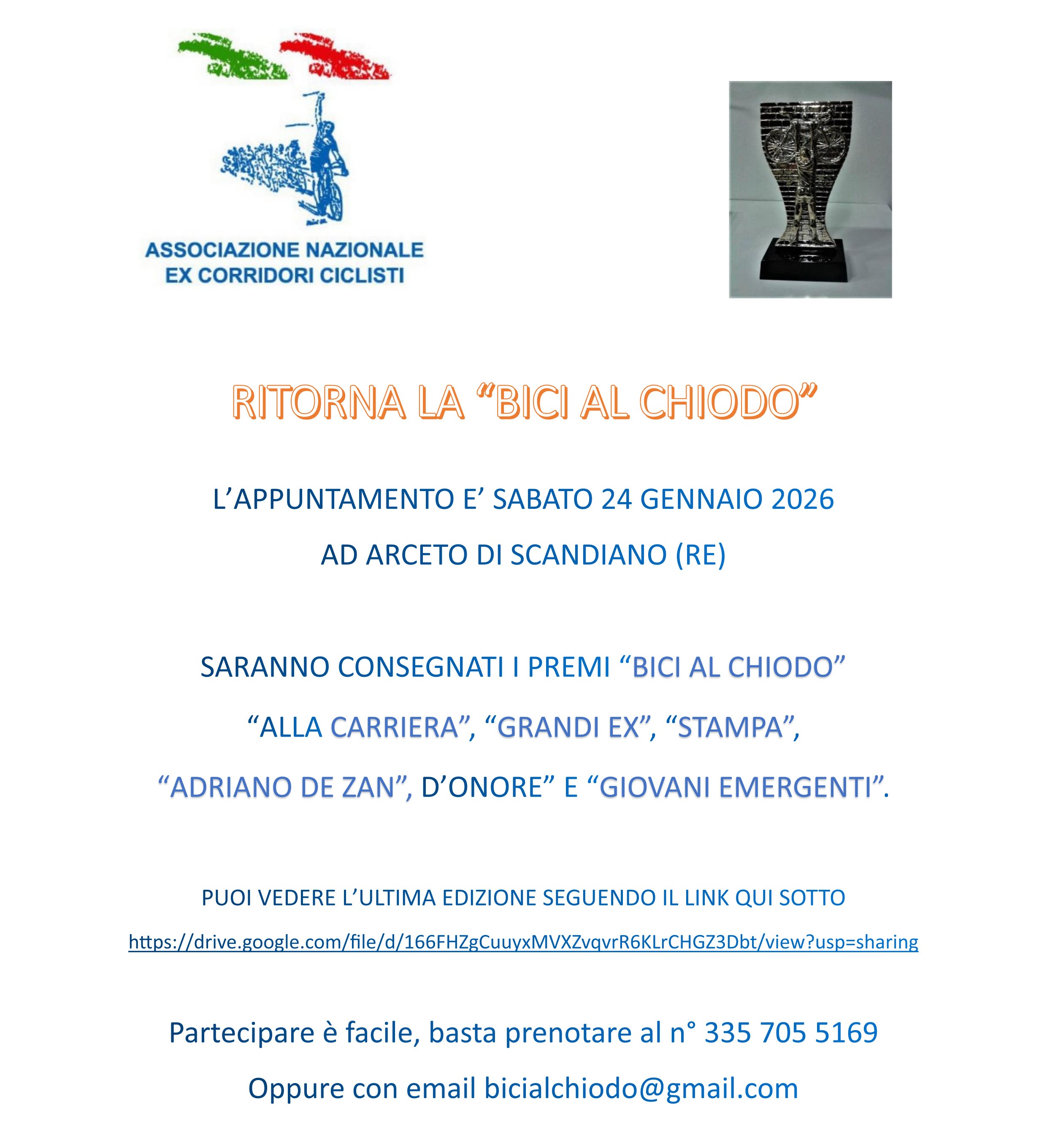 Si, come annunciato dal Presidente dell’Associazione Nazionale Ex Corridori Ciclisti, Gianpaolo Tedeschi, la Bici al Chiodo torna e lo farà in grande stile nella nuova location ubicata nel Comune di Scandiano (Frazione di Arceto) l giorno 24 gennaio 2026, un sabato!