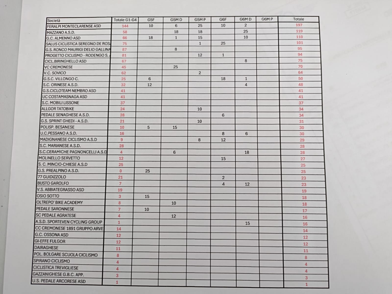 1)Feralpi Monteclarense punti 197; 2)Asd Mazzano 119; 3)GC Almenno 110; 4)Salus Ciclistica Seregno 101; 5)GS Ronco Maurigi 95; 7)Biringhello 75; 11)SC Orinese 48; 18)Polisportiva Besanese 30; 25)GS Prealpino 25; 27)SC Busto Garolfo 23; 28)VS Abbiategrasso 19; 31)Pedale Saronnese 17; 35)GC Ossona 12; 37)US Dairaghese 11.
