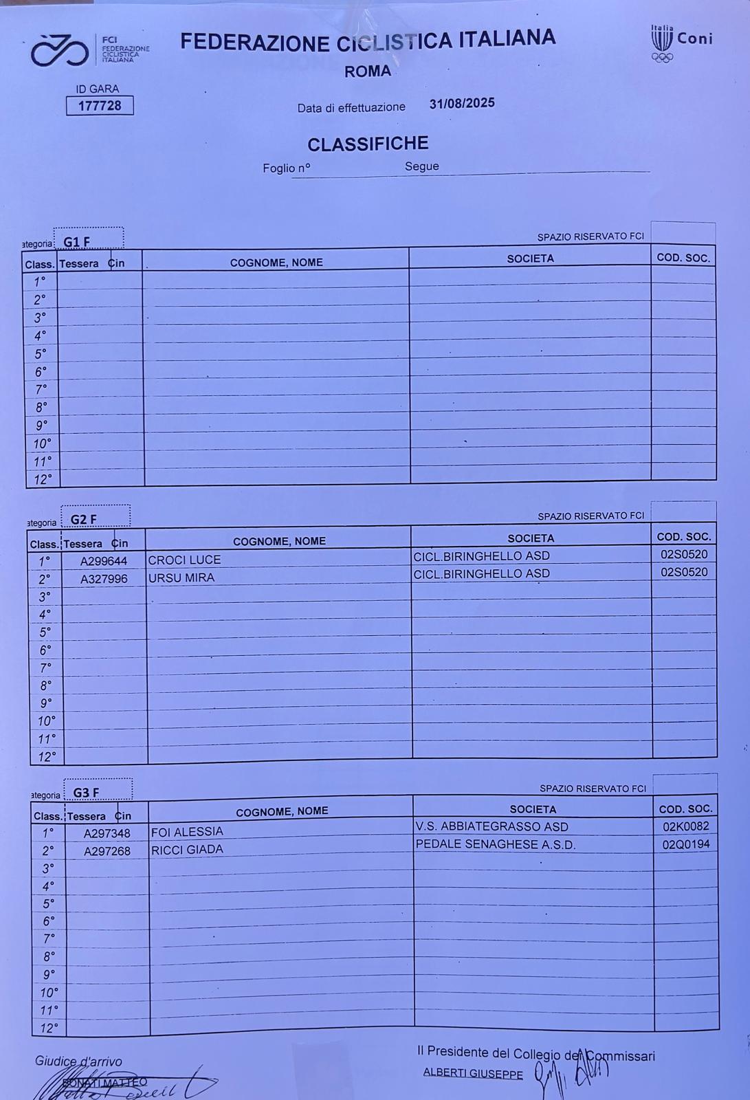Per quanto riguarda la categoria G2 Femminile, le concorrenti era due, Luce Croci e Mira Ursu, classificate nell’ordine ed entrambe della Ciclistica Biringhello.