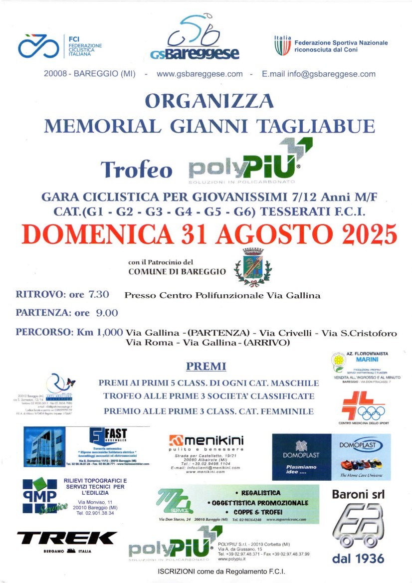 La Carovana del Ciclismo di Domani approda in quel di Bareggio nel milanese dove, con l’organizzazione della gloriosa “Bareggese” del Presidente Pietro Pastorino, domenica 31 agosto 2025 si è disputato il Memorial Gianni Tagliabue-Trofeo PolyPiù.