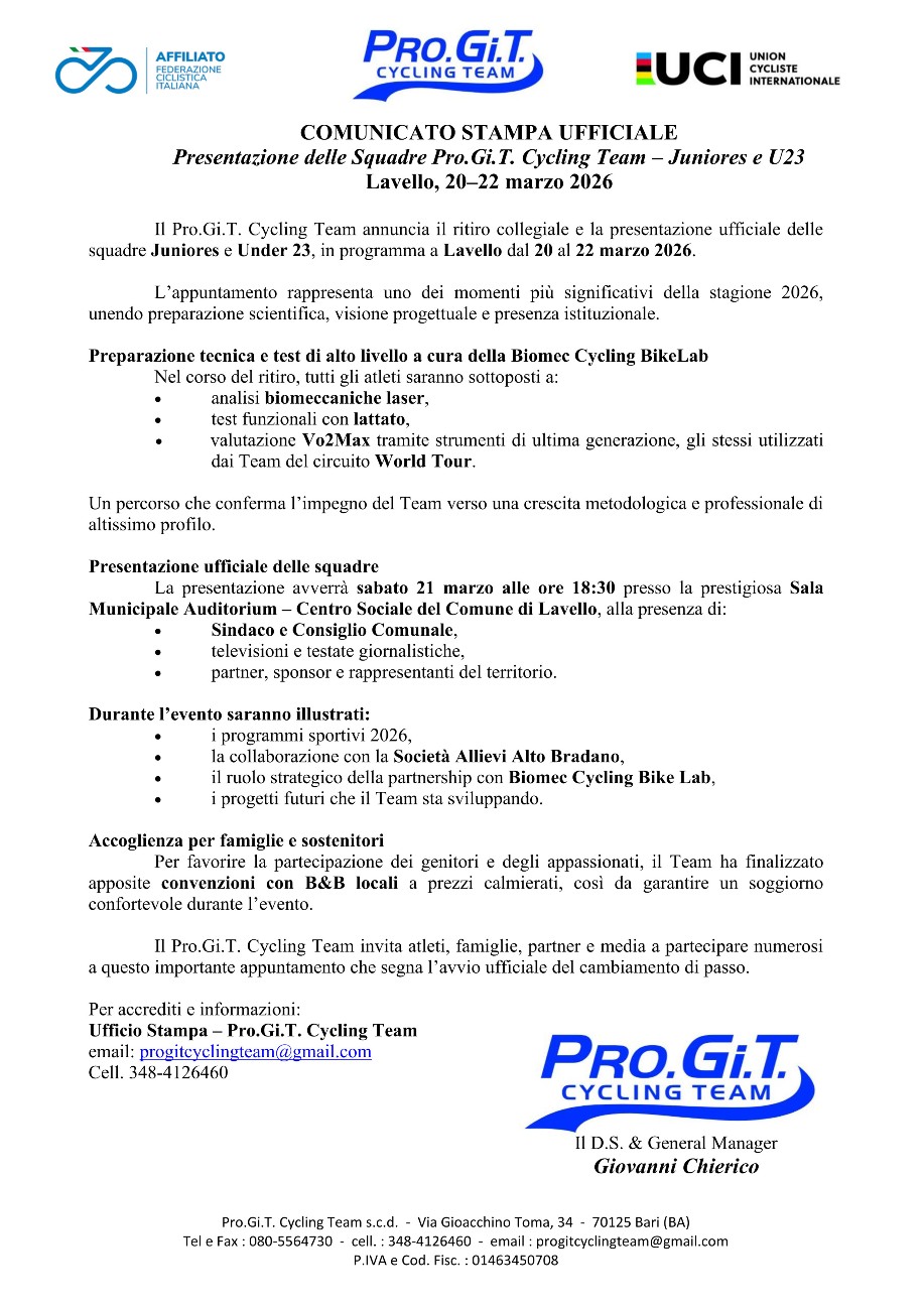 Oltre alla presentazione ufficiale delle squadre verranno illustrati i programmi sportivi 2026 e sancita la collaborazione con la Società Esordienti e Allievi della Società lucana Alto Bradano oltre al ruolo strategico della partnership con Biomec Cycling Bike Lab e dei progetti futuri che il Team sta sviluppando.
