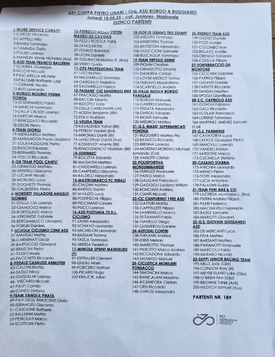 ORDINE DI ARRIVO 63° Coppa Pietro Linari :