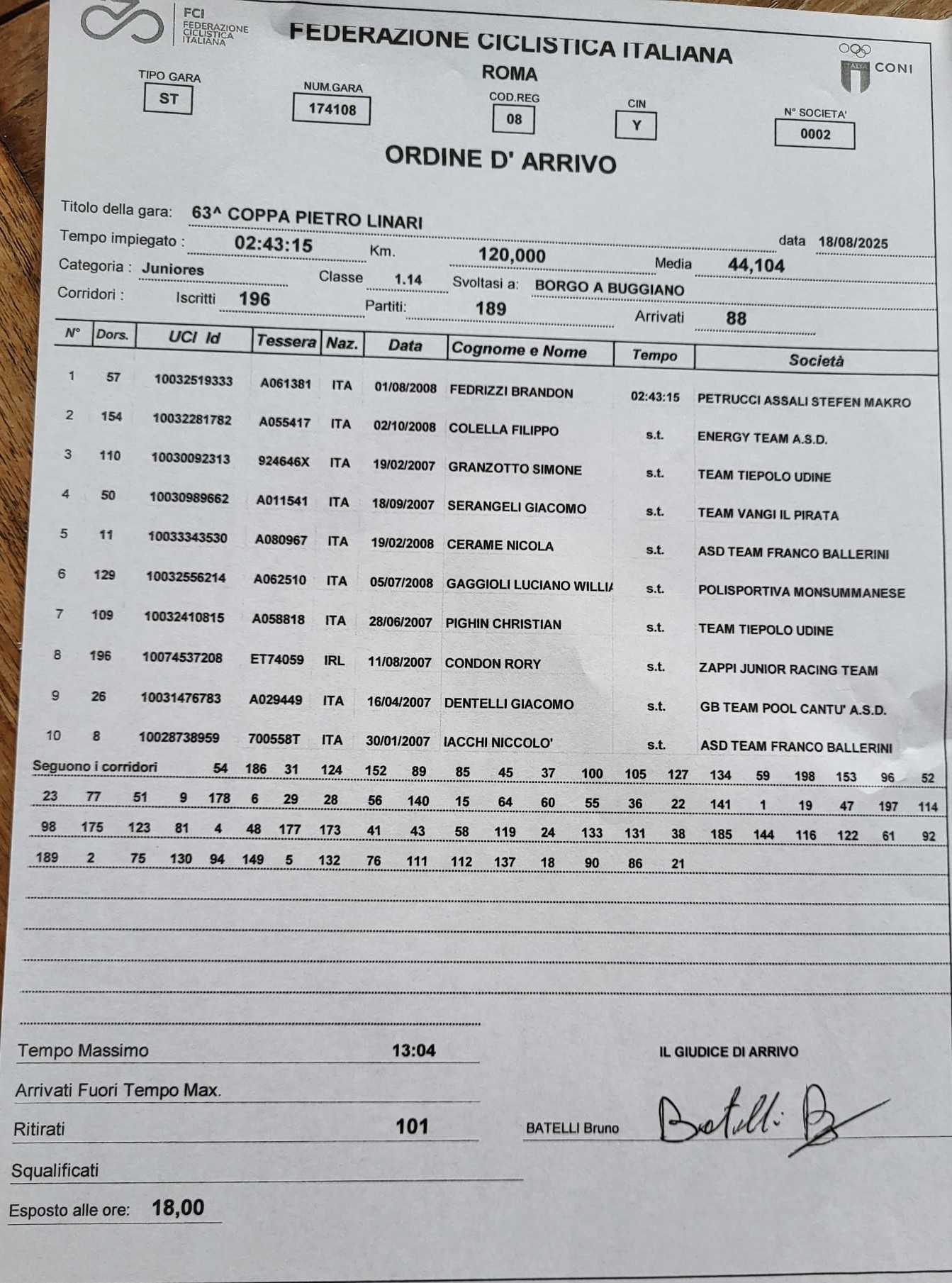 1)Brandon Fedrizzi (Petrucci Assali Stefen Makro) km 120, in 2h43’15”, media km 44,104;