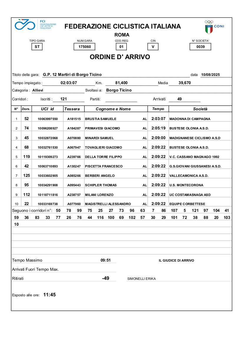 .98 corridori ai nastri di partenza di questa edizione del GP 12 Martiri di Borgo Ticino, gara molto combattuta che ha falcidiato il gruppo che all’arrivo ha portato 49 corridori, giusto la metà dei partiti.