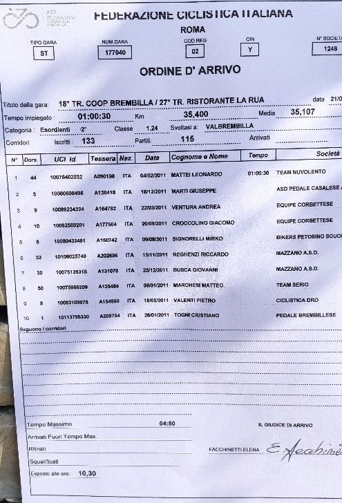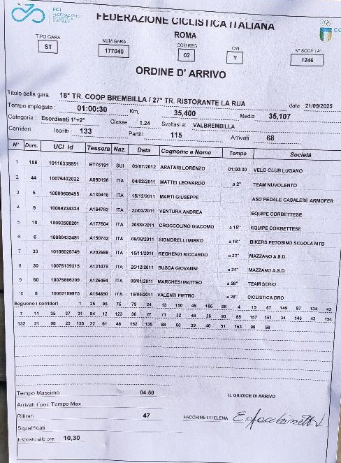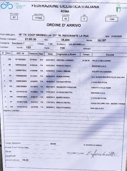 Ottava vittoria stagionale per l’Esordiente 1° anno (Classe 2012) Lorenzo Aratari (Velo Club Lugano) che a Brembilla nel bergamasco ha vinto la gara unica “18° Trofeo Coop Brembilla – 27° Trofeo Ristorante La Rua” staccando tutti gli avversari precedendo al traguardo il bresciano Leonardo Mattei (Team Nuvolento) di 2″ scompigliando anche tutto il gruppo che ha portato a termine la gara molto spezzettato.