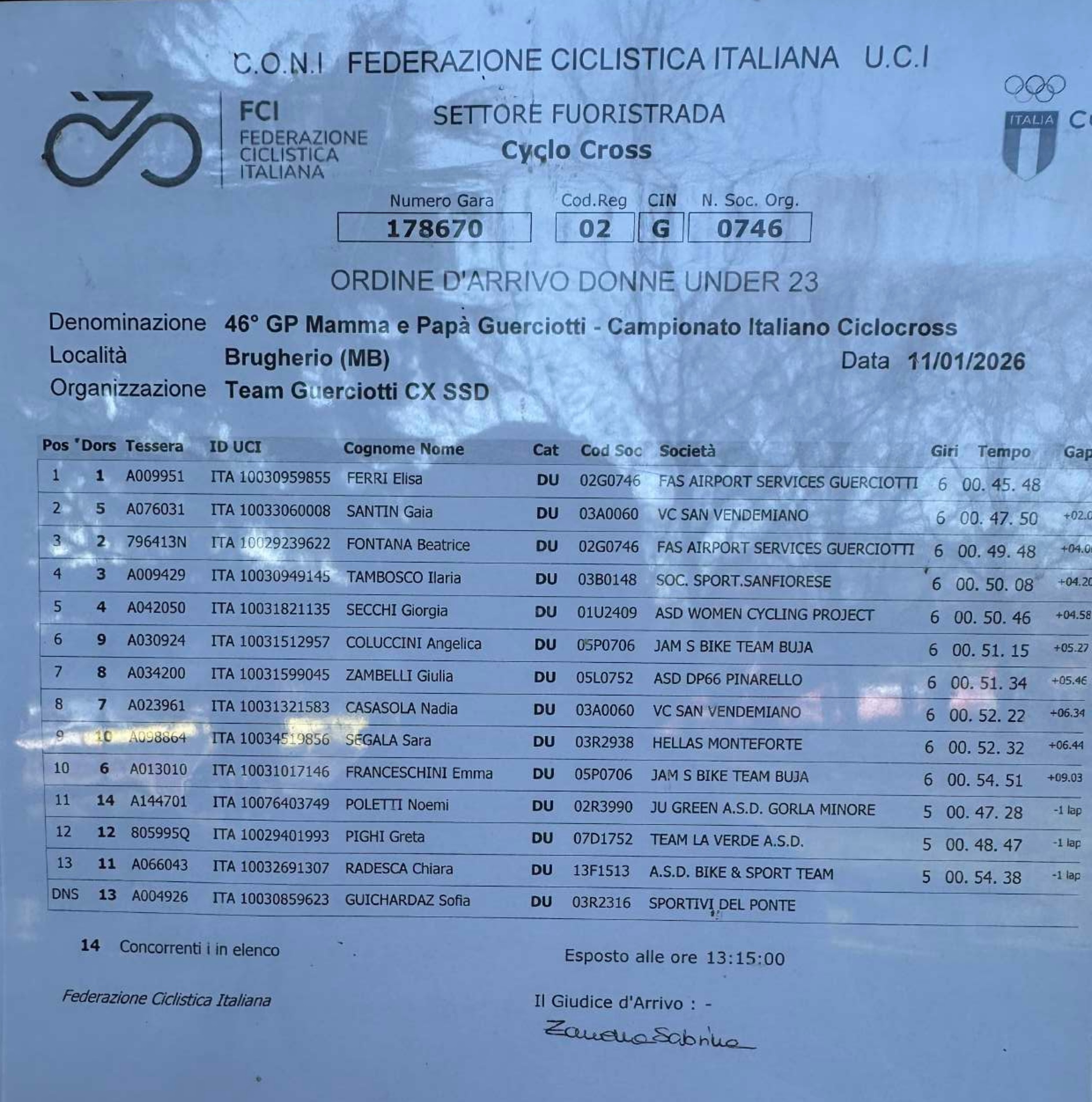 Non è stato un successo facile come molti pensavano; In una gara di un giorno, può succedere di tutto, ha dichiarato dopo il traguardo Elisa Ferri : Ieri ero molto tesa però oggi, subito dopo avere abbassato la bandierina del via, tutto è andato per il meglio e adesso, dopo il totale di 11 maglie tricolori vinte nelle specialità della Mountain Bike, Pista e Ciclocross devo decidere su quale specialità puntare.
