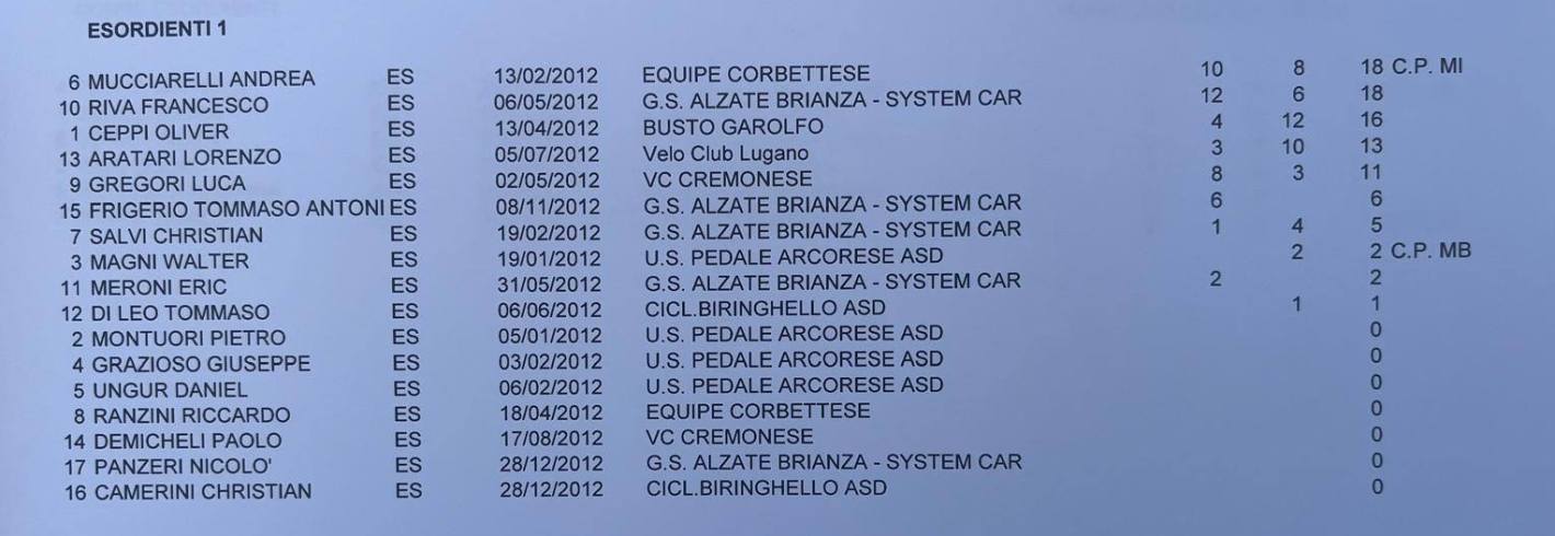 Per quanto riguarda il titolo di Campione Provinciale Esordienti 1° anno di Monza e Brianza, è Walter Magni (US Pedale Arcorese) a fregiarsi del Titolo .