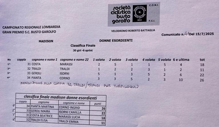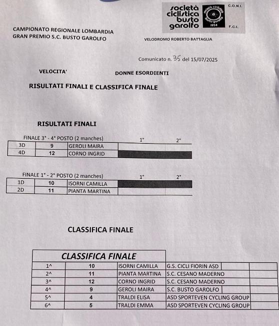 Martedì 15 luglio sul tondino Roberto Battaglia di Busto Garolfo, si sono disputati i Campionati regionali lombardi su pista categorie maschili e femminili Allievi ed Esordienti.