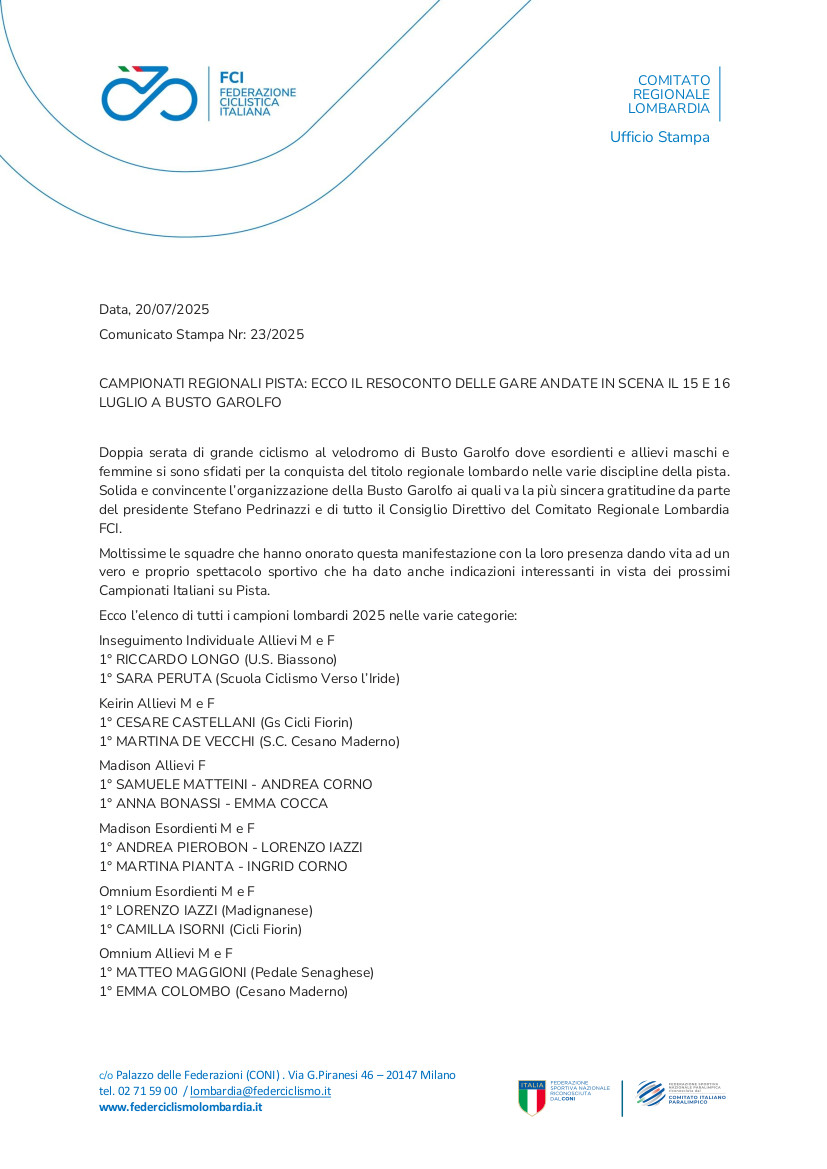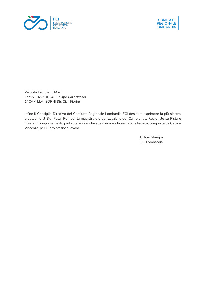 Di seguito il prezioso Comunicato Stampa inviatoci dal Comitato Regionale Lombardo e alcuni ordini d’arrivo procurati dalla Fotoreporter Jessica Moran che ringraziamo anche per le belle foto che scatta in tutte le manifestazioni del ciclismo giovanile.