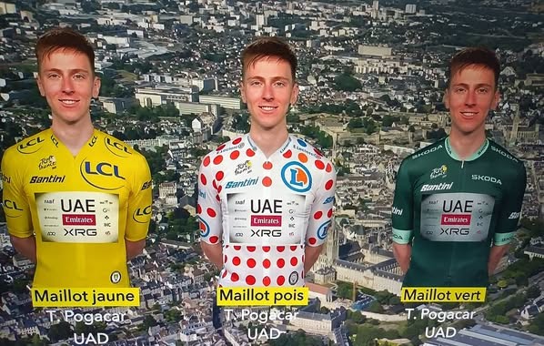Tadej Pogacar tappa e maglie (Gialla, Verde e Pois)