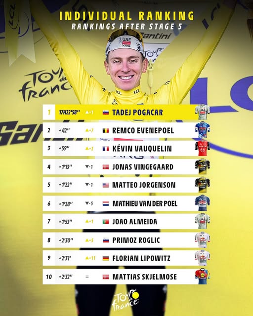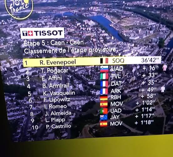 Van der Poel ha perso la maglia, le crono per giunta lunghe come quella odierna (km 33) sono piuttosto indigeste per l’olandese che però non si perso, si è difeso nei limiti consentitegli dalle sue caratteristiche tecniche e sarà sempre li in agguato a partire proprio da domani perchè nella sesta tappa da Bayeux a Vire Normandie di km 201,5 troverà pane per i suoi denti lungo i 201,5 chilometri della tappa con un menù di 6 strappi o muri che dir si voglia che lo invitano a nozze.