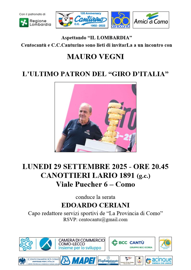 CentoCantù ha organizzato un incontro con MAURO VEGNI direttore del Giro d’Italia e delle altre classiche di RCS Sport, quali Milano-Sanremo, Strade Bianche e, appunto, del Lombardia.