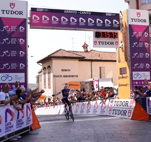 Cantù, 16 giugno 2025 – Giornata da incorniciare per Jonathan Vervenne al Giro Next Gen Carta Giovani Nazionale. Il belga, protagonista di una lunga azione solitaria, ha vinto la Rho Fiera Milano-Cantù ed è la nuova Maglia Rosa dell’edizione 2025. La sua azione è partita a 128 km dall’arrivo, in compagnia dello svizzero Ilian Barhoumi, per poi proseguire in solitaria quando mancavano 61 km al traguardo. Nonostante la pressione costante del gruppo Maglia Rosa, il vantaggio di Vervenne si è mantenuto tra i 2 e i 3 minuti, stabilizzandosi sopra il minuto fino agli ultimi chilometri. Il gruppo è arrivato con 30 secondi di ritardo, regolato allo sprint da Aubin Sparfel, davanti a Mirko Bozzola e Jarno Widar, vincitore dell’edizione 2024 e attesissimo protagonista nella tappa di domani, la Albese con Cassano–Passo del Maniva, frazione di alta montagna con arrivo in salita ai 1744 metri del Passo del Maniva, la Cima Coppi del Giro Next Gen 2025. Sarà la prima giornata cruciale per i pretendenti alla vittoria finale.