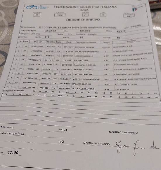 1)Thomas Bernardi (Team Giorgi) km 104 in 2h22’32” media kmh. 43,779;