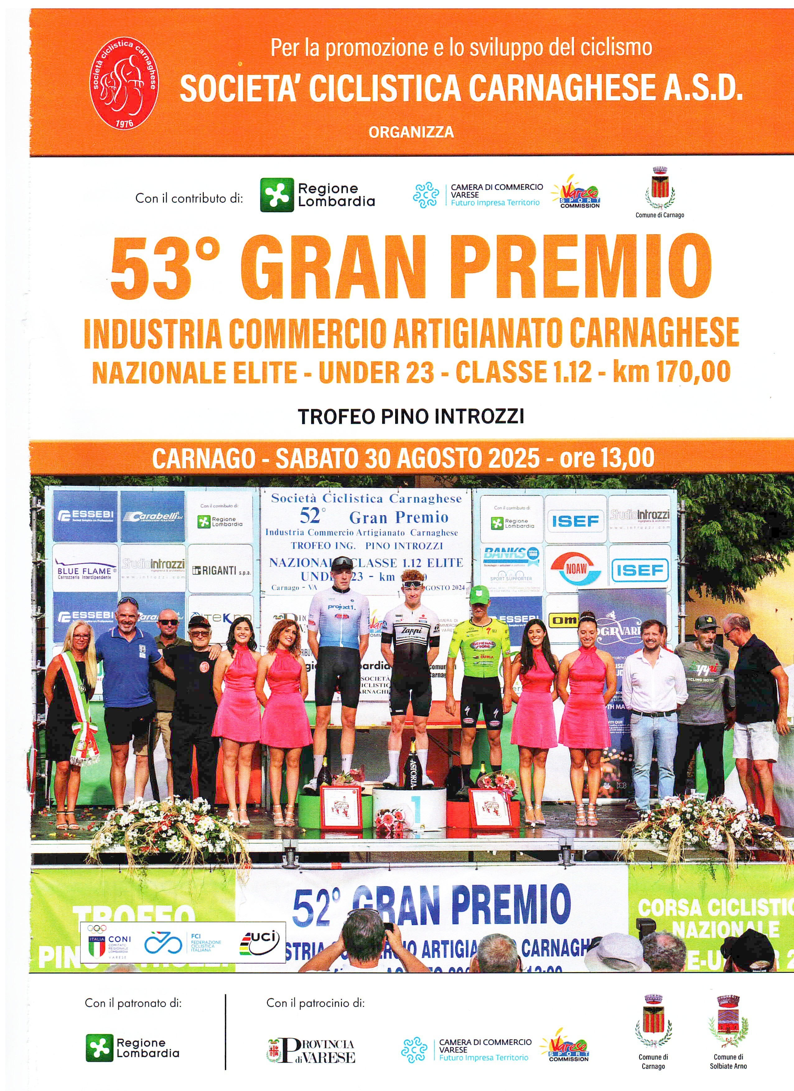 Torna puntualissimo l’appuntamento col grande ciclismo che, a Carnago, è di casa col Gran Premio Industria Commercio e Artigianato Carnaghese, gara giunta alla 53° edizione che scatterà con 170 corridori (tanti sono gli iscritti a due gg dalla gara) con partenza dalla centralissima via Castiglioni a Carnago, dove verrà tracciata anche la linea del traguardo.