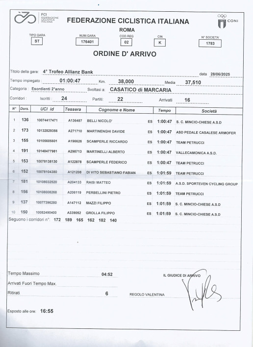 Tra gli esordienti del 2° anno il successo è andato a Nicolò Belli del Mincio Chiese; 7° è giunto Matteo Raisi dello Sporteven, Filippo Mazzi 9° e Filippo Grolla 10° per il Mincio Chiese.