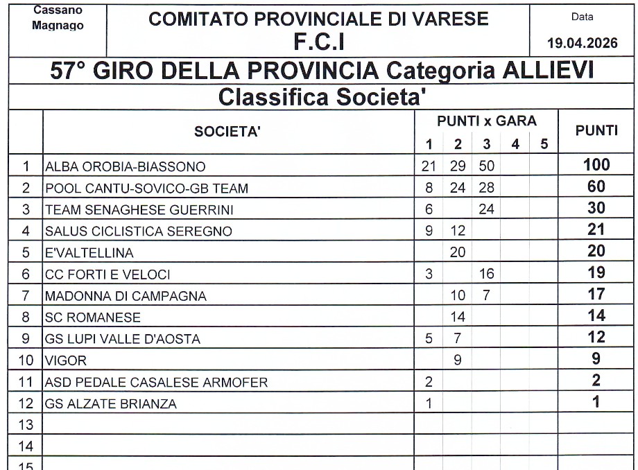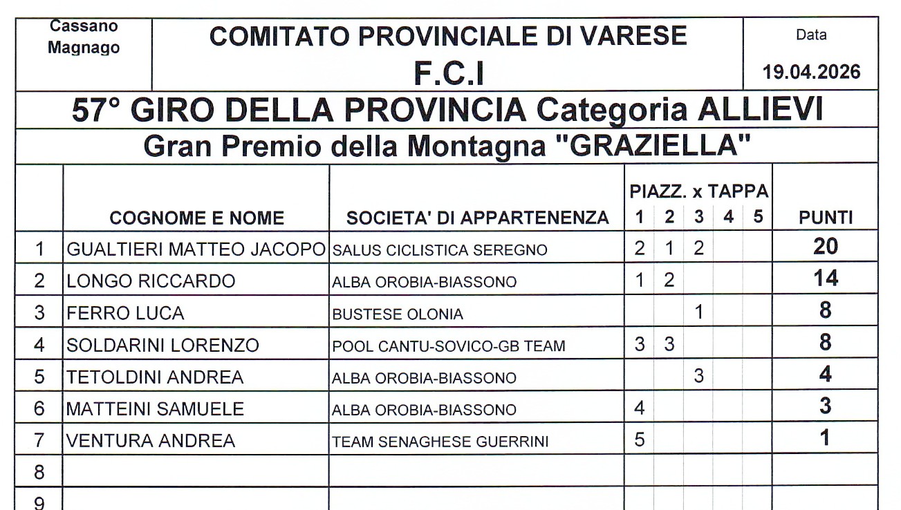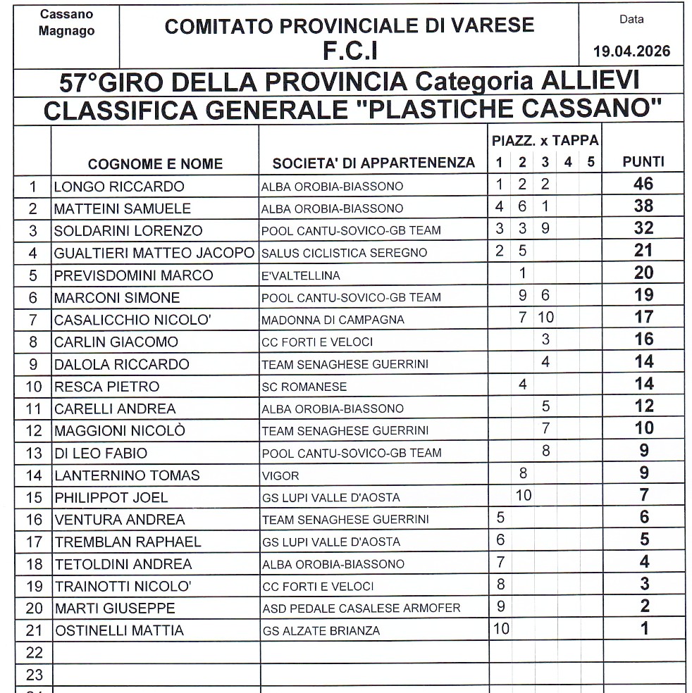 Con la performance di oggi, Samuele Matteini, corridore di Garbagnate Milanese balza al secondo posto della classifica generale a 8 punti dal suo compagno di squadra Riccardo Longo e dedica la vittoria ai genitori Silvia e Andrea.