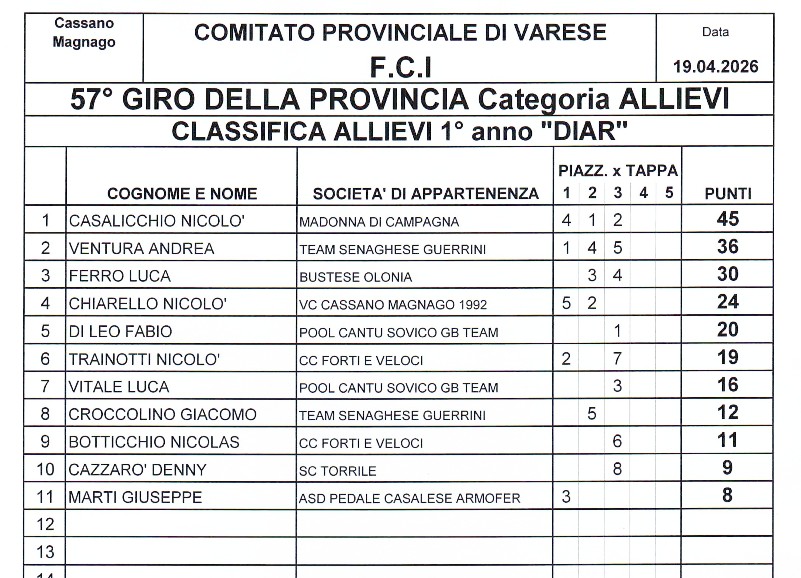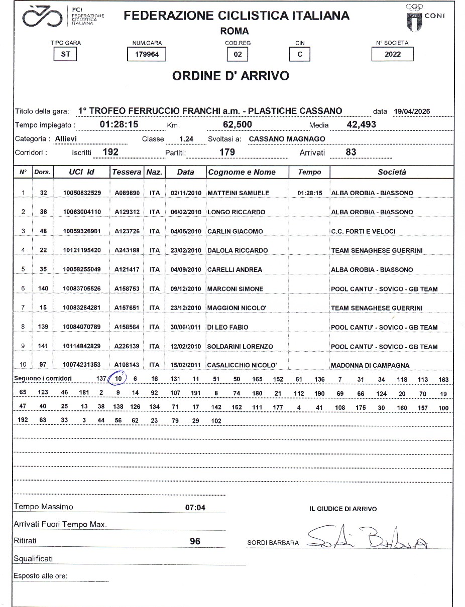 1) Samuele Matteini (Alba Orobia-Biassono) km 62,5 in 1h28’15” media kmh. 42,493; 2) Riccardo Longo (Albe Orobia-Biassono); 3) Giacomo Carlin (CC Forti e Veloci); 4) Riccardo Dalola (Team Senaghese-Guerrini); 5) Andrea Carelli (Alba Orobia-Biassono); 6) Simone Marconi (Pool Cantù-Sovico-GB Team); 7) Nicolò Maggioni (Senaghese Guerrini); 8) Fabio Di Leo (Pool Cantù-Sovico-GB Team); 9) Lorenzo Soldarini (Pool Cantù-Sovico-GB Team); 10) Nicolò Casalicchio (Madonna di Campagna).–