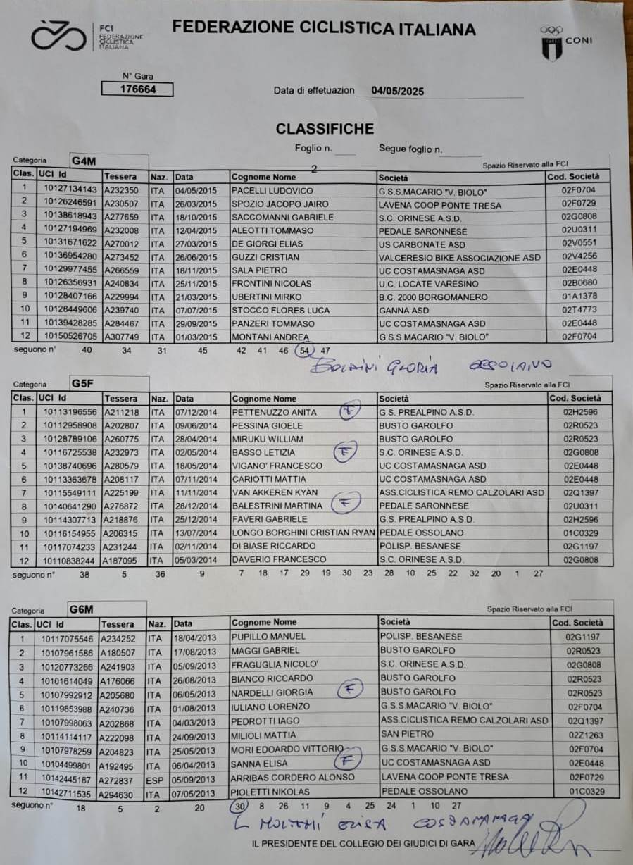 E sono ancora i mini corridori della Presidentessa Katia Turchi e di Angelo Lenzi a conquistare il gradino più alto del podio tra i G4 con Ludovico Pacelli vincitore su Jairo Jacopo Spozio della Lavena Coop Ponte Tresa (Presidentessa Rosanna Guarneri).