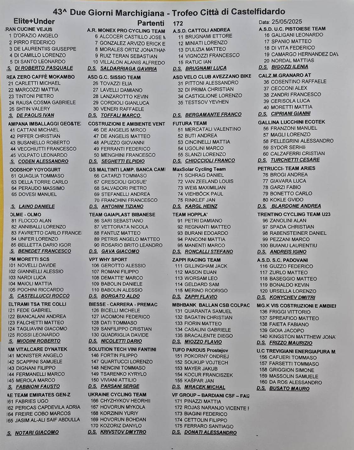 Con 35 squadre in gara, tra cui cinque formazioni straniere e per un totale di 175 atleti protagonisti, la Due Giorni Marchigiana resta un trampolino per chi sogna di fare il grande salto nel ciclismo che conta in ambito professionistico. Non è mancato l’omaggio a Mirco Soprani, figura di riferimento del territorio fidardense, nonchè ex sindaco e colonna portante dell’organizzazione della Due Giorni, scomparso il 5 aprile scorso.