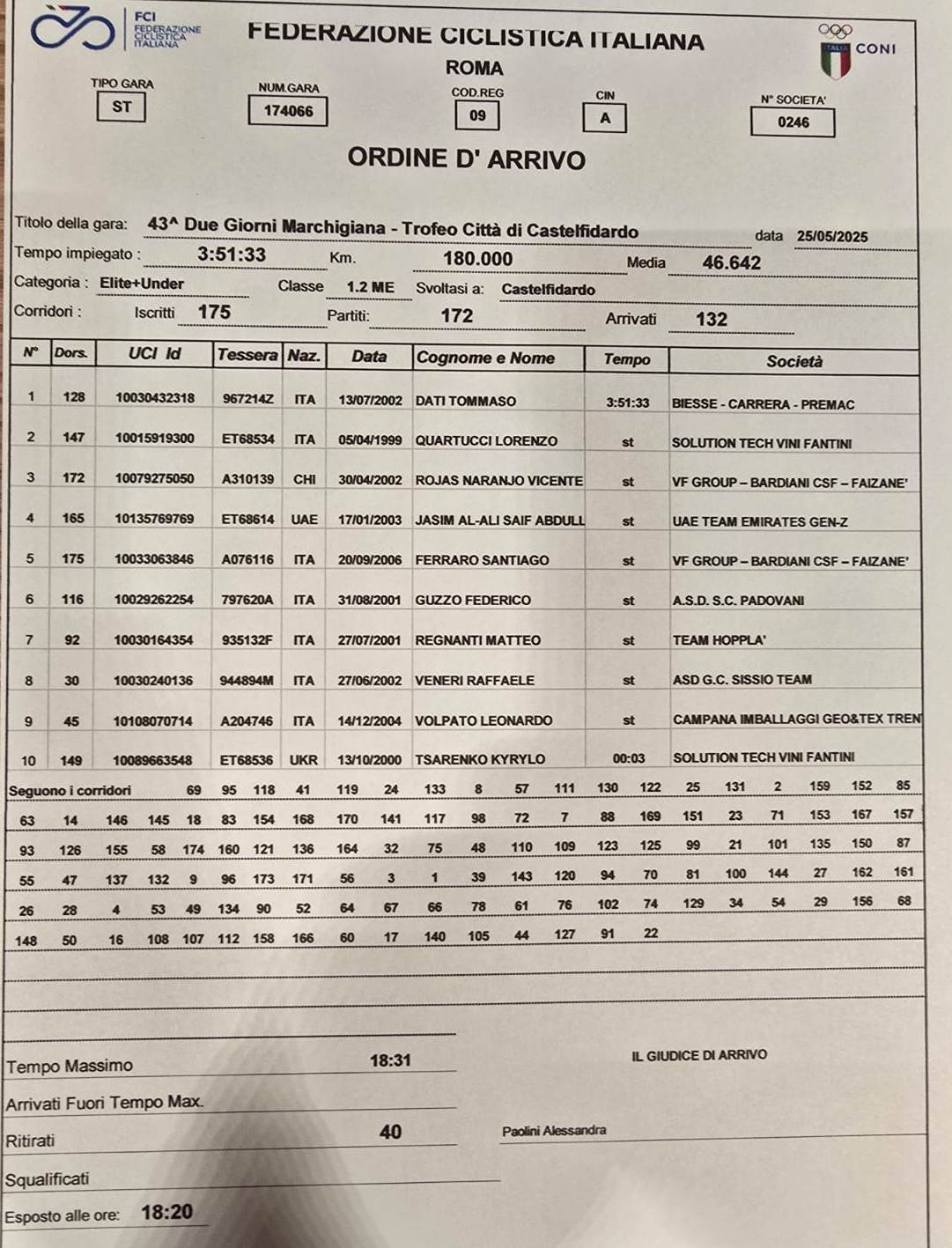 Con l’affermazione ottenuta al Trofeo Città di Castelfidardo e al quarto posto colto nel Gran Premio Santa Rita, il toscano Dati si è aggiudicato anche la classifica combinata della Due Giorni (Challenge Semar).