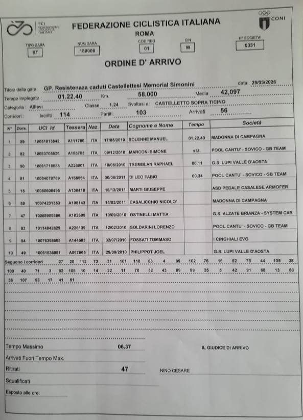 Brillante vittoria del torinese Manuel Solenne (SC Madonna di Campagna) che a Castelletto Sopra Ticino nel novarese, si impone nel Memorial Simonini-Caduti Castellettesi imponendosi allo sprint sull’alfiere del Pool Cantù-Sovico-GB Team, Simone Marconi con quale aveva preceduto gli inseguitori nell’ordine, Raphael Tremblan (Lupi Valle D’Aosta) di 11″ e il resto degli inseguitori battuti in volata da un altro alfiere della squadra dell’ex professionista Gianluca Bortolami, Fabio Di Leo a 34″.