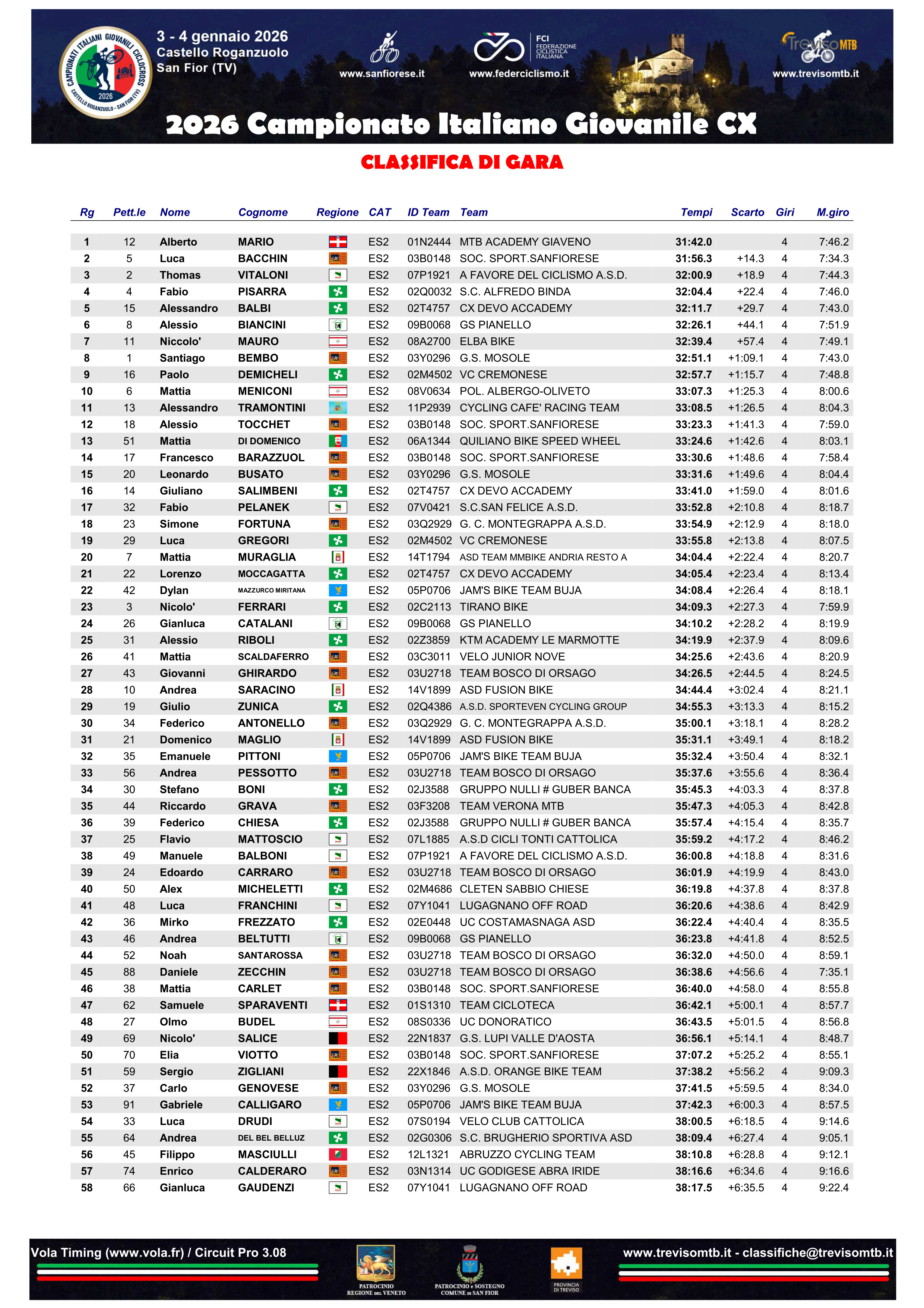 Mario Alberto ha vinto con un vantaggio di 14″ sul padrone di casa Luca Bacchin (Società Sportiva Sanfiorese 1945) e 18″ sull’emiliano Thomas Vitaloni (A Favore del Ciclismo).