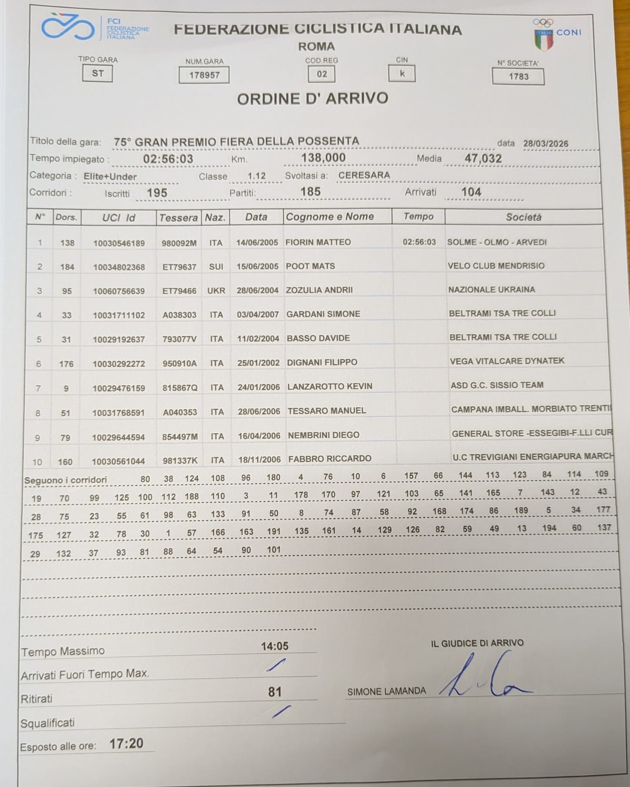 È stato di Matteo Fiorin del Solme Olmo l’acuto vincente nel 75° Gp Fiera della Possenta.
