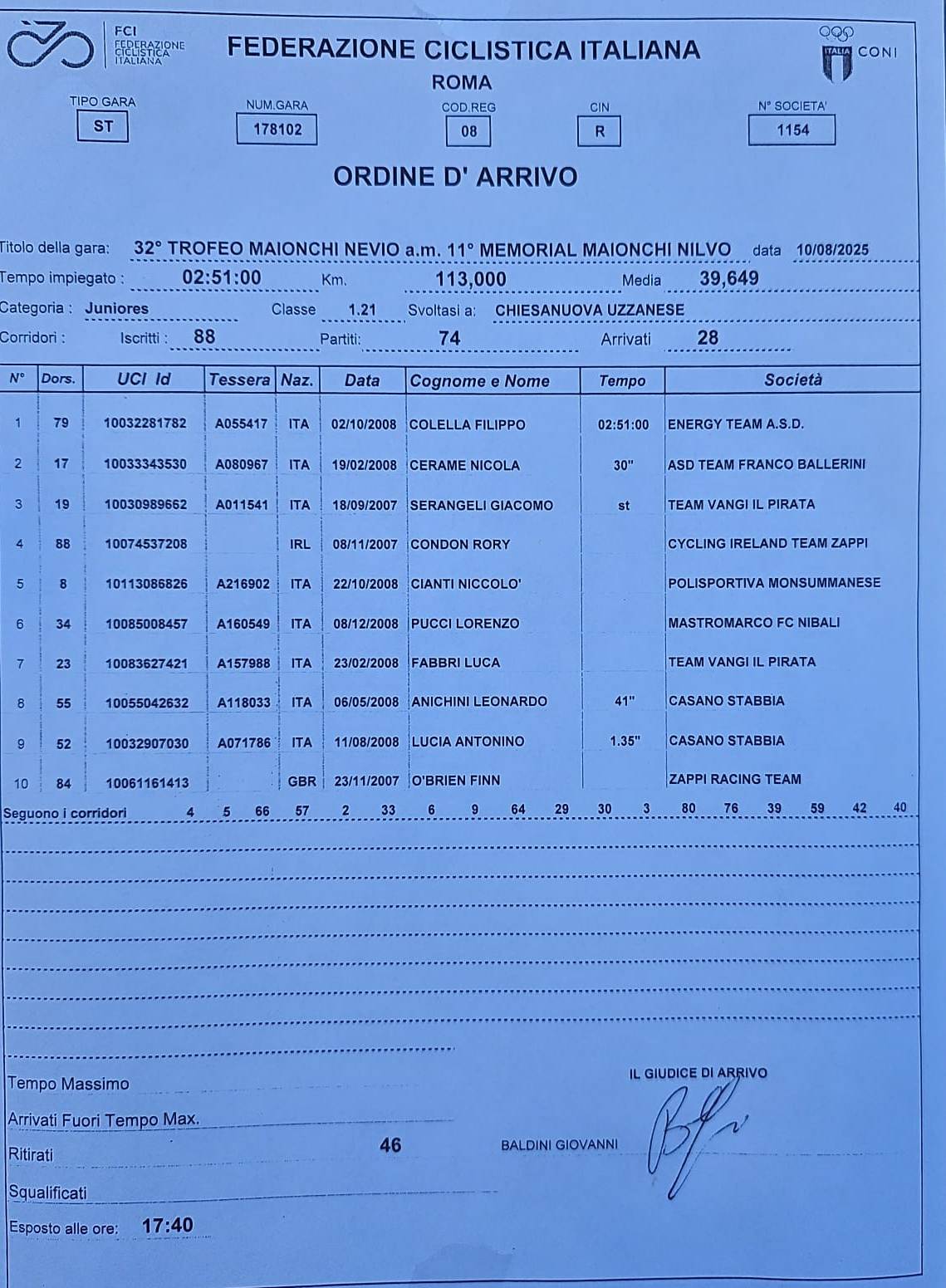 1)Filippo Colella (Energy Team) km 113, in 2h51’, alla media di km 39,649;