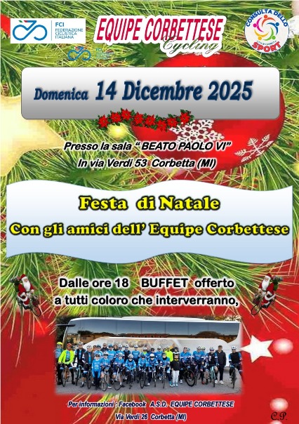 Domenica 14 Dicembre presso la sala Beato Paolo VI ubicata in via Verdi nr. 53 a Corbetta, il Presidente dell’Equipe Corbettese Enrico Sangalli con la collaborazione di tutto il Consiglio Direttivo organizza la tradizionale “Festa del Santo Natale” alla quale invita gli Amici, gli Estimatori e tutti gli Sportivi desiderosi di intervenire.