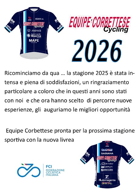 Nella stessa giornata verranno presentate le tre squadre agonistiche dell’Equipe Corbettese (Giovanissimi, Esordienti e Allievi) che inaugurano anche la nuova livrea che vestiranno in corsa nella stagione 2026.
