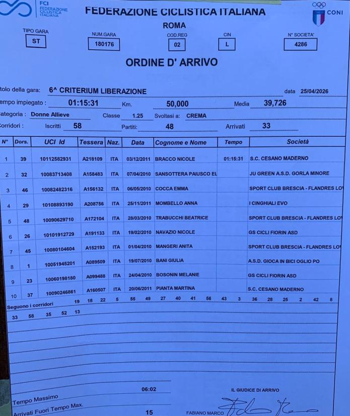 Nicole Bracco, allieva primo anno della SC Cesano Maderno vince allo sprint il “6° Criterium Liberazione”, gara ciclistica di chilometri 50,00 riservato alla categoria Donne Allieve che in 48 si sono schierate sulla linea di partenza tracciata nel centro di Crema in Viale Santa Maria della Croce che sarà anche linea bianca del traguardo.