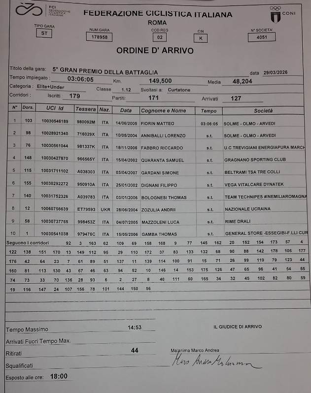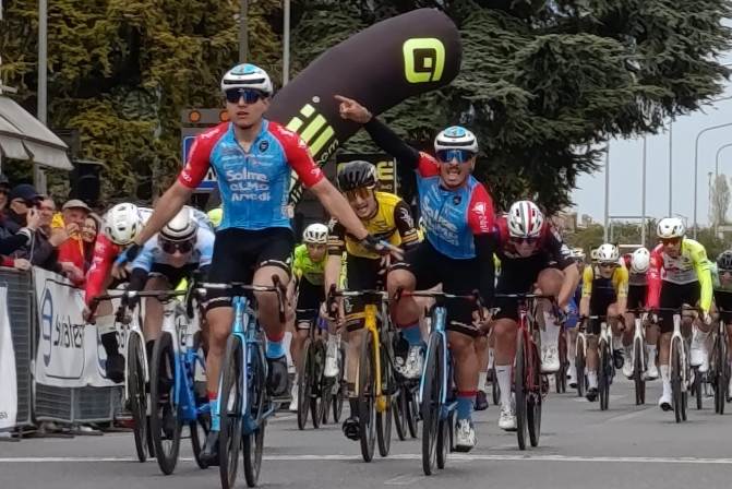 Con uno sprint entusiasmante Matteo Fiorin del Solme Olmo Arvedi ha porto ieri pomeriggio a Montanara la propria firma sull’albo d’oro del 5° Gp della Battaglia.