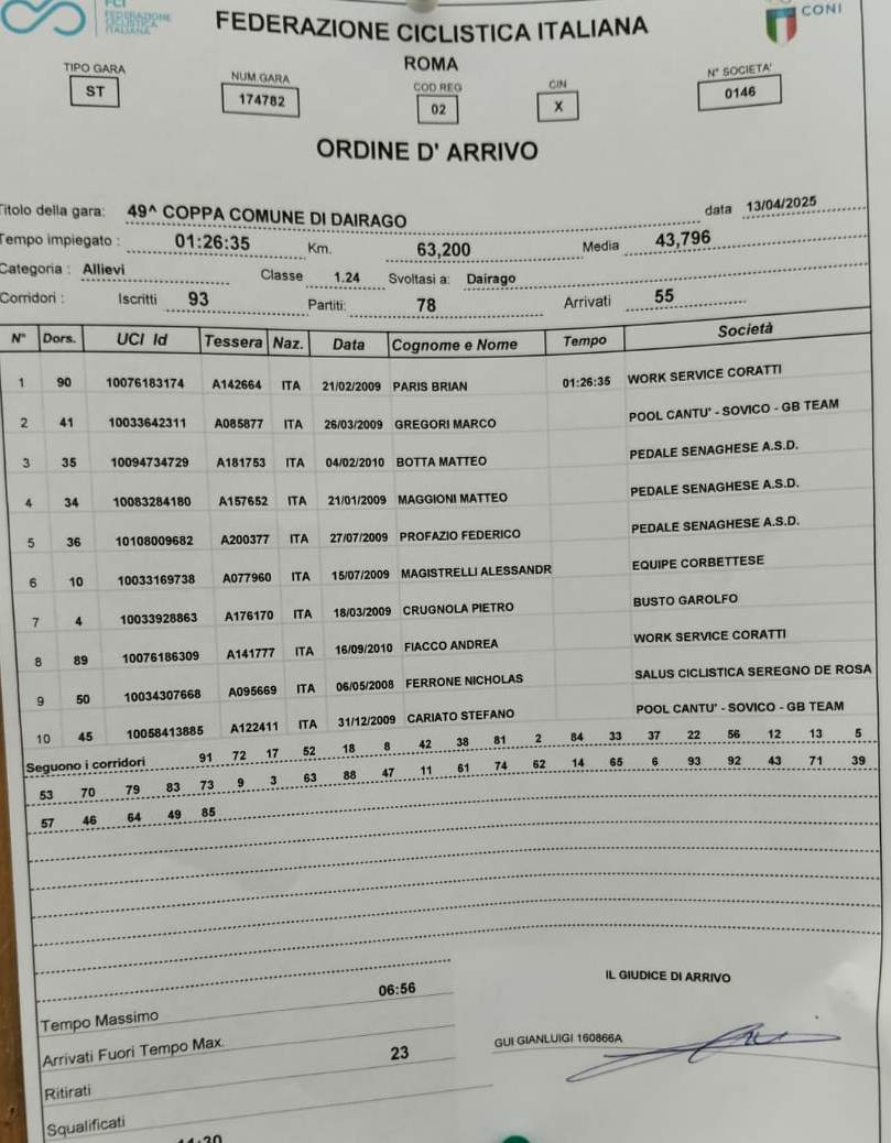 Poi nelle concitate fasi dello sprint finale cade l’alfiere dell’US Legnanese 1913 Gabriele Luzzi, varesino di Gerenzano, senza gravi conseguenze come dichiarato dal suo Direttore Sportivo Giovanni Fornara mentre, Brian Paris fila verso la sua terza vittoria tutta dedicata alla squadra e ai compagni ma anche alle famiglie che si sono autotassate per permettere questa lunga doppia trasferta da Roma a Brusimpiano (Varese) per partecipare sabato 12 aprile alla 10° edizione della Croscalata alla Madonna di Ardena e oggi qui a Dairago.