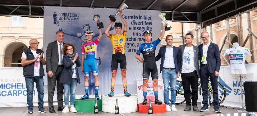 La cerimonia di premiazione, condotta dallo speaker Fabrizio Amadio, ha regalato momenti di grande emozione e riconoscimento per tutti i protagonisti della giornata. Si sono succeduti Massimo Romanelli (Presidente del Comitato Regionale FCI Marche), Fabio Luna (Presidente del CONI Marche) e Lino Secchi (Presidente Onorario della Federciclismo Marche) così come i due Sindaci dei comuni di partenza e di arrivo Patrizio Leonelli (Castelraimondo) e Roberto Lucarelli (Camerino). A rendere ancora più intensa la cerimonia, la presenza della famiglia Scarponi con i genitori Flavia e Giacomo.
