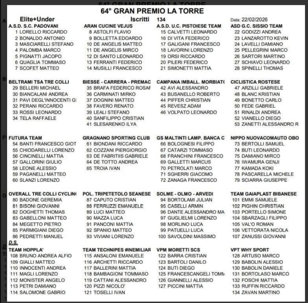 Con 176 corridori ai nastri di partenza e 76 che hanno portato a termine la gara si è disputato a Fucecchio il 64° Gran Premio La Torre, gara di valenza nazionale e caratterizzata dalla fuga di tre corridori, Nicolò Pizzi 19 anni, abruzzese di Lanciano in casacca Technipes #inEmiliaRomagna con Stefano Masciarelli (SC Padovani Polo Cherry Bank) e Gabriel Fede (Ciclistica Rostese).