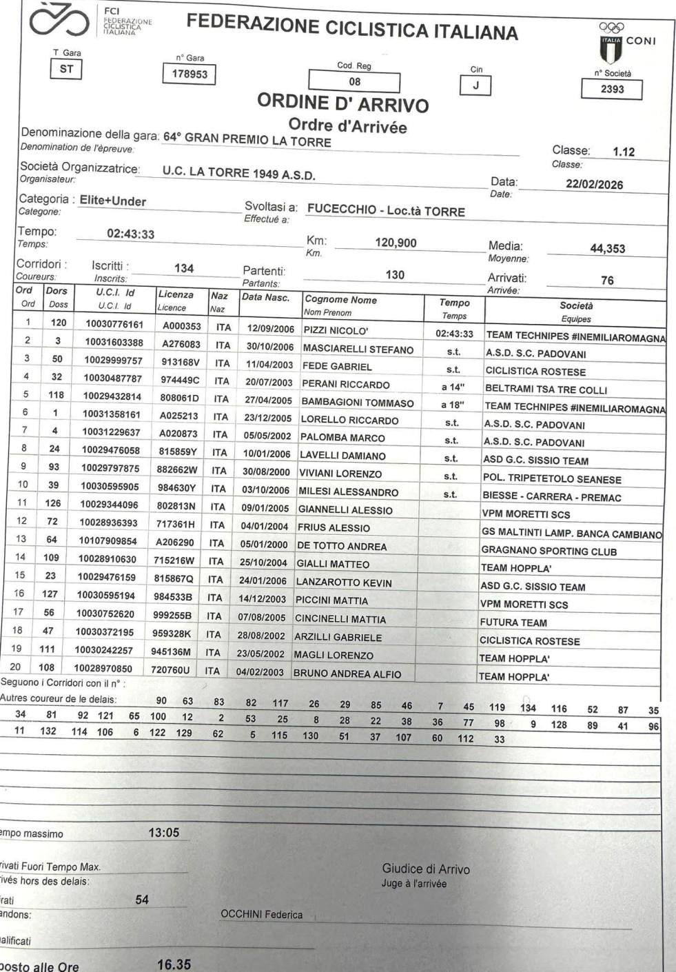 1 PIZZI Nicolò (#Technipes #inEmiliaRomagna); km 120 in 2h43’33” media kmh 44,352;
