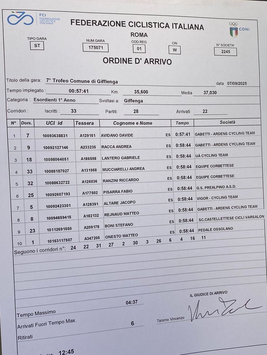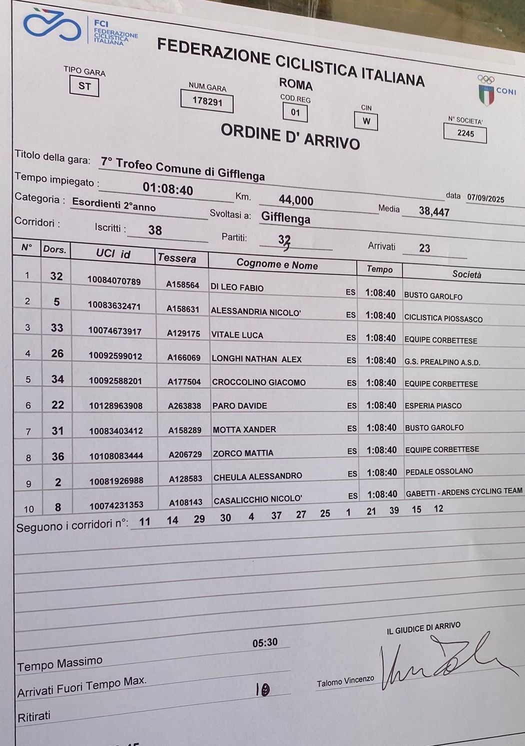 Tra i primo anno invece la spunta in solitaria il piemontese Davide Avidano (Gabetti – Ardens Cycling Team) con 57” sui Corbettesi Andrea Mucciarelli (4) e Riccardo Ranzini (5), mentre al sesto e nono posto rispettivamente i varesini di Carnago, Fabio Pisarra (GS Prealpino) e Stefano Boni (SC Castellettese – Cicli Varsalona).