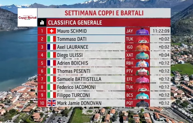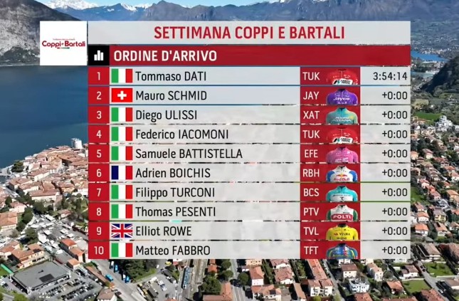TOMMASO DATI VINCE A ISEO LA TERZA TAPPA DELLA SETTIMANA INTERNAZIONALE COPPI E BARTALI. SCHMID NUOVO LEADER