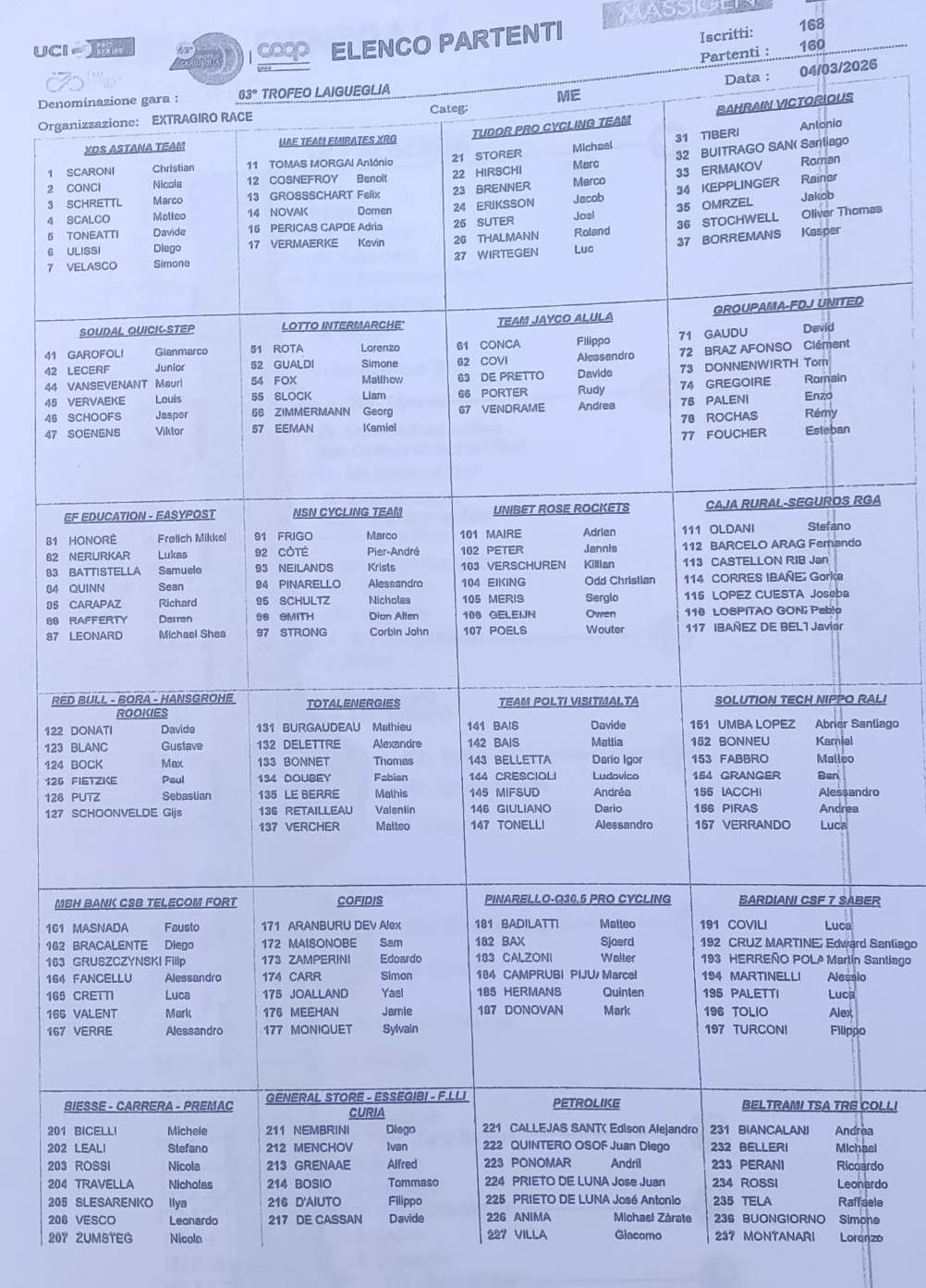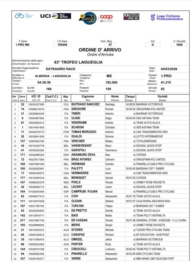 “Sono molto contento di conquistare questa prima vittoria così presto in stagione, e ancora di più perché arriva qui in Liguria, dove ho vissuto nel 2019”, ha detto Buitrago. “È speciale vincere qui. Abbiamo corso molto bene come squadra, con grande intelligenza, ed è fantastico avere anche Antonio sul podio, terzo. Tutta la squadra ha fatto un ottimo lavoro nel controllare la gara.