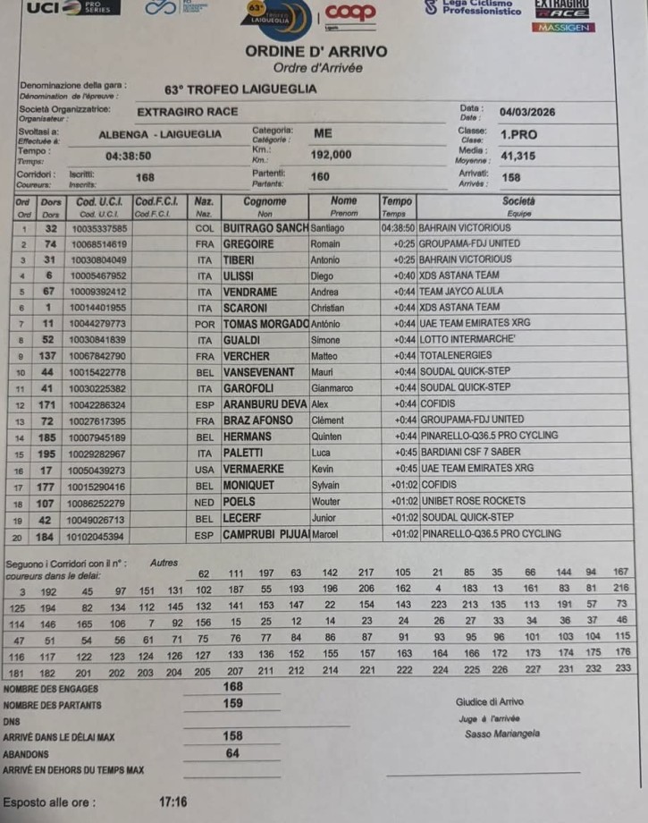 “Sono molto contento di conquistare questa prima vittoria così presto in stagione, e ancora di più perché arriva qui in Liguria, dove ho vissuto nel 2019”, ha detto Buitrago. “È speciale vincere qui. Abbiamo corso molto bene come squadra, con grande intelligenza, ed è fantastico avere anche Antonio sul podio, terzo. Tutta la squadra ha fatto un ottimo lavoro nel controllare la gara.